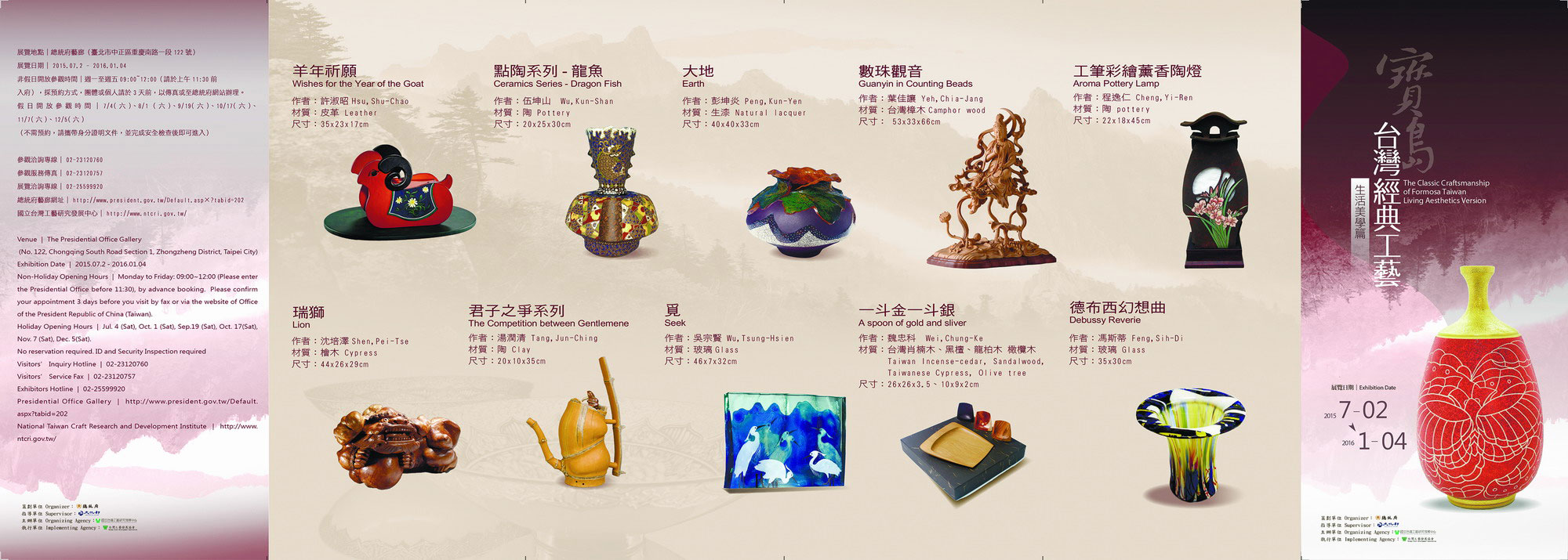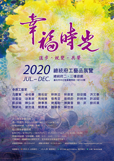 幸 福 時 光~進步•蛻變•共榮 – 總統府工藝品展 展覽日期: 2020年7月~12月 展覽地點:總統府2、3樓迴廊 展覽地點:(台北市中正區重慶南路一段122號)