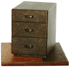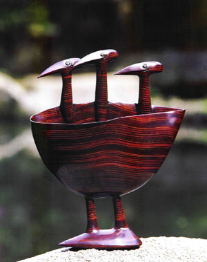 When he was a journalist, once he had to interview many crafts centers, museums and artists for a report of “beauty in lives”. By this contact his childhood passion about leather was awakened. Immediately he gave up the press without any hesitation and threw himself into leather art in 1974, in the age of 33. Such as sporty gestures from his memory of childhood, affections from his life experiences, sympathy for animals and so on, all turn into his creative inspirations. He is definitely an artist in possession of a writing style and original ideas. By appreciating his work and sensing his creative motives, it always excites you like an impassioned current inside of you for a long. His specialty of applying Urushi (Japanese traditional lacquer) as a medium represents leather in a new form without losing its nature flavor. Such an achievement cannot be accumulated simply by time, endurance and techniques.